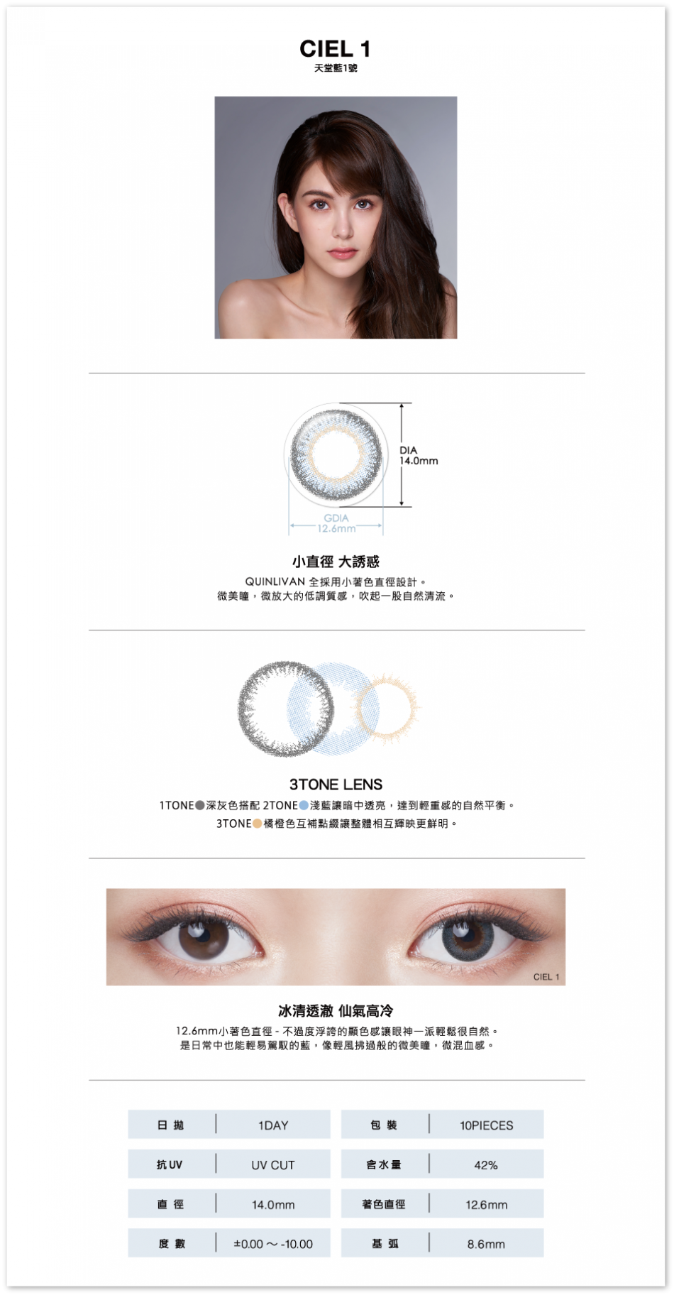 < 此商品不適用於全店9折優惠 > \ 買2盒 $100/1 買4盒 $95/1 / 如需混款 請使用CODE 2盒 [ quin02 ] 4盒[ quin04 ] 逢星期一15:00截單,需預訂約3-5個工作天 ⊹ 直徑:14.0mm 著色直徑:12.6mm 含水量:42% 弧度:8.6mm UV:UV CUT 📌雙眼不同度數請選購2盒 購買前請先確保已細閱購物需知🙌🏻
